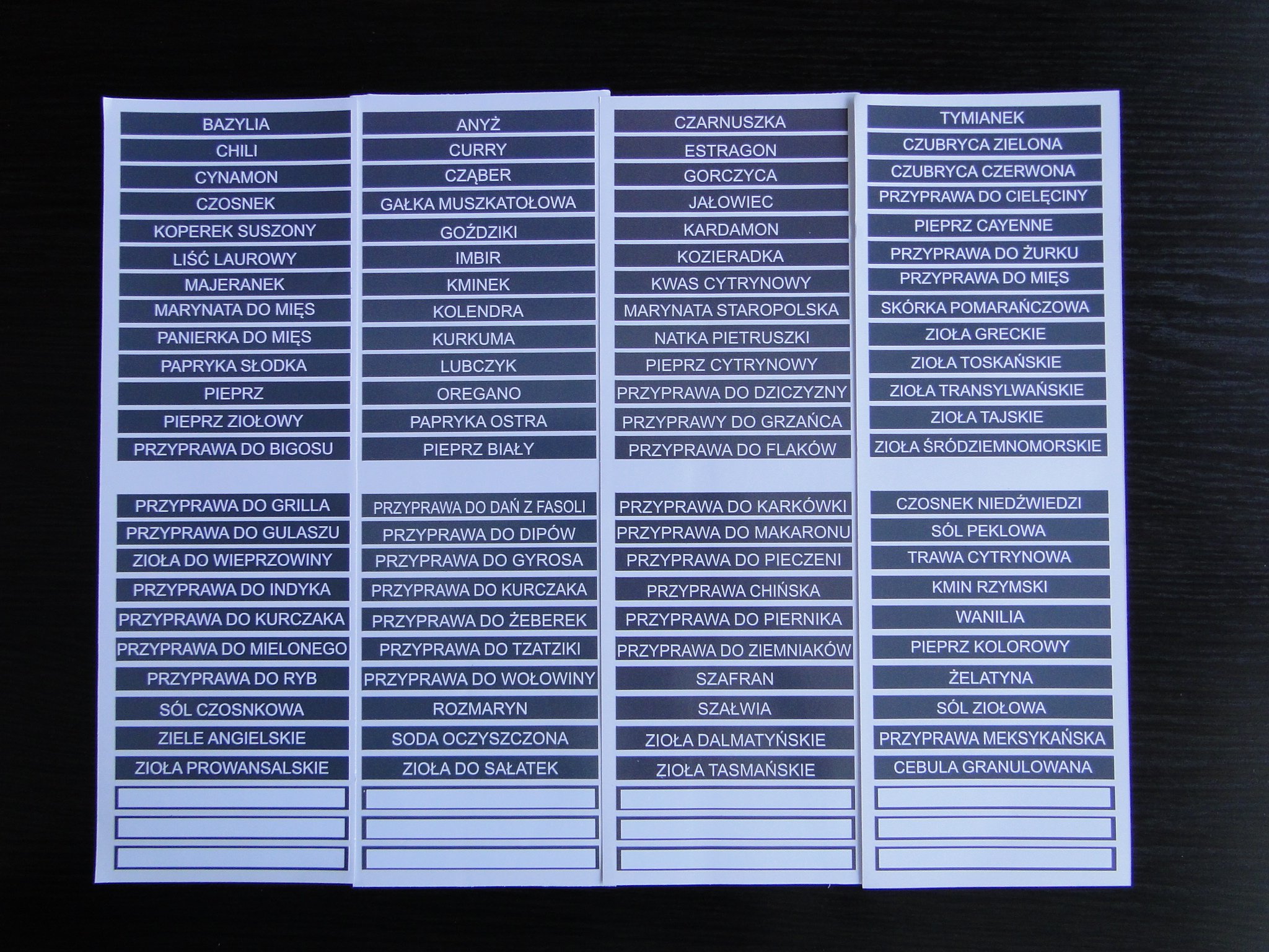 - - jeden zestaw naklejek rozpoczynających się od przyprawy BAZYLIA (uwaga: jeśli chcesz zmienić domyślny komplet naklejek na inny, to napisz nam w wiadomości dla sprzedającego pierwszą nazwę przyprawy z wybranego zestawu: ANYŻ,TYMIANEK lub CZARNUSZKA)